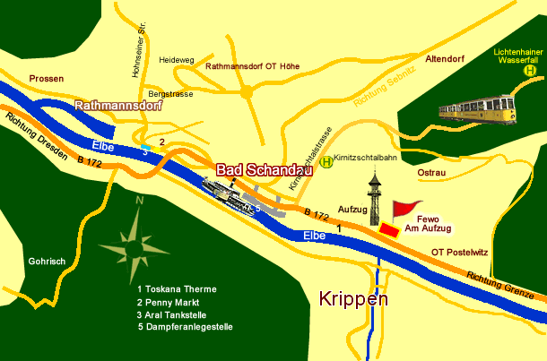 | Anfahrt von Dresden über die A17 bis Abfahrt Pirna - Bad Schandau. Sie fahren in Richtung Pirna und kommen direkt auf die B172. Weiter auf der B172 über Königstein bis Bad Schandau Zentrum .Nach dem Marktplatz biegt die Hauptstraße rechts ab in Richtung Schmilka - Grenzübergang. Sie fahren bis zum Aufzug auf der linken Seite und sind an unserer Ferienwohnung. | |||||||||||||||||||||||||
